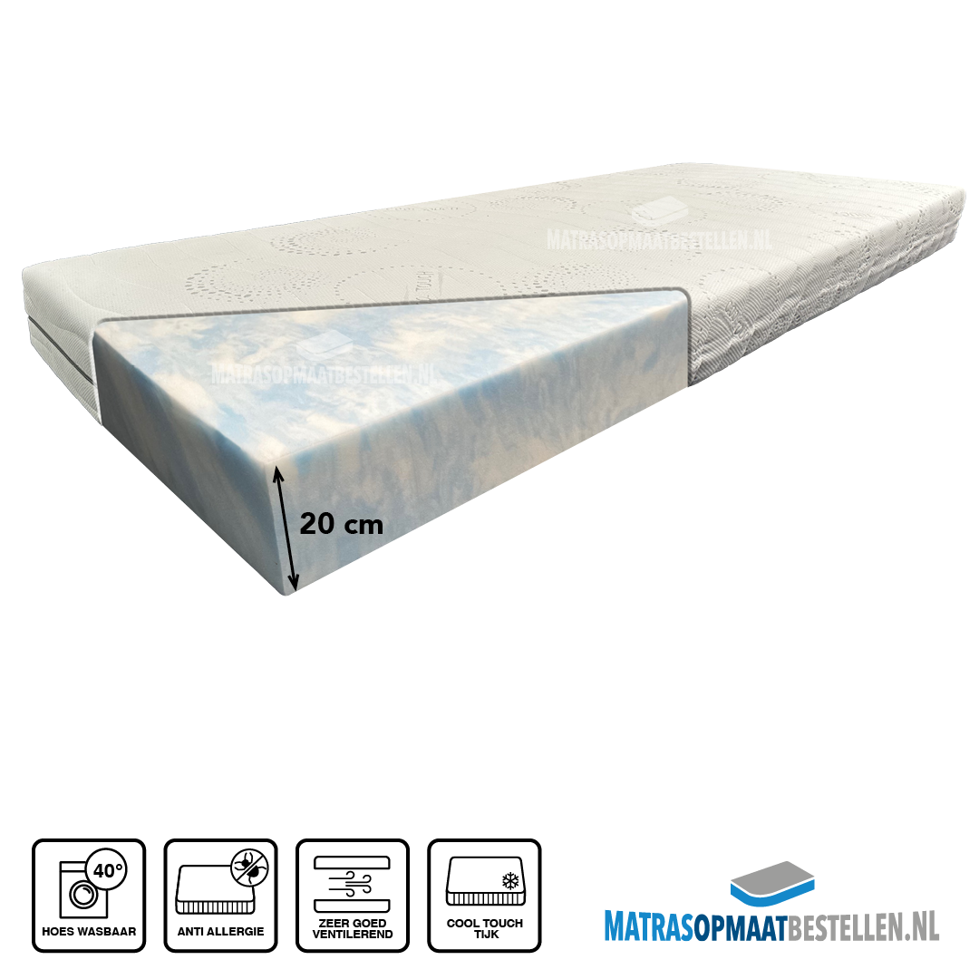 Koudschuim HR55+ is de dikkere variant van de normale HR55 matras ,Deze kwaliteitsmatras heeft een dikte van 20 cm incl matrastijk (medium tot stevig ligcomfort) De hoge dichtheid garandeerd een perfecte levensduur en comfort voor personen tot 140 kg, Koudschuim in een hoge dichtheid garandeerd een fantastisch goede ondersteuning en levensduur. De zeer open celstructuur zorgt voor een uitstekende transpiratie en vochtverwerking en een aangenaam slaapklimaat. De matras heeft standaard een afneembaar wasbare hoes,voor een kleine meerprijs leveren wij deze met Cooltouch® tijk, 40 graden wasbaar,anti bacterieel