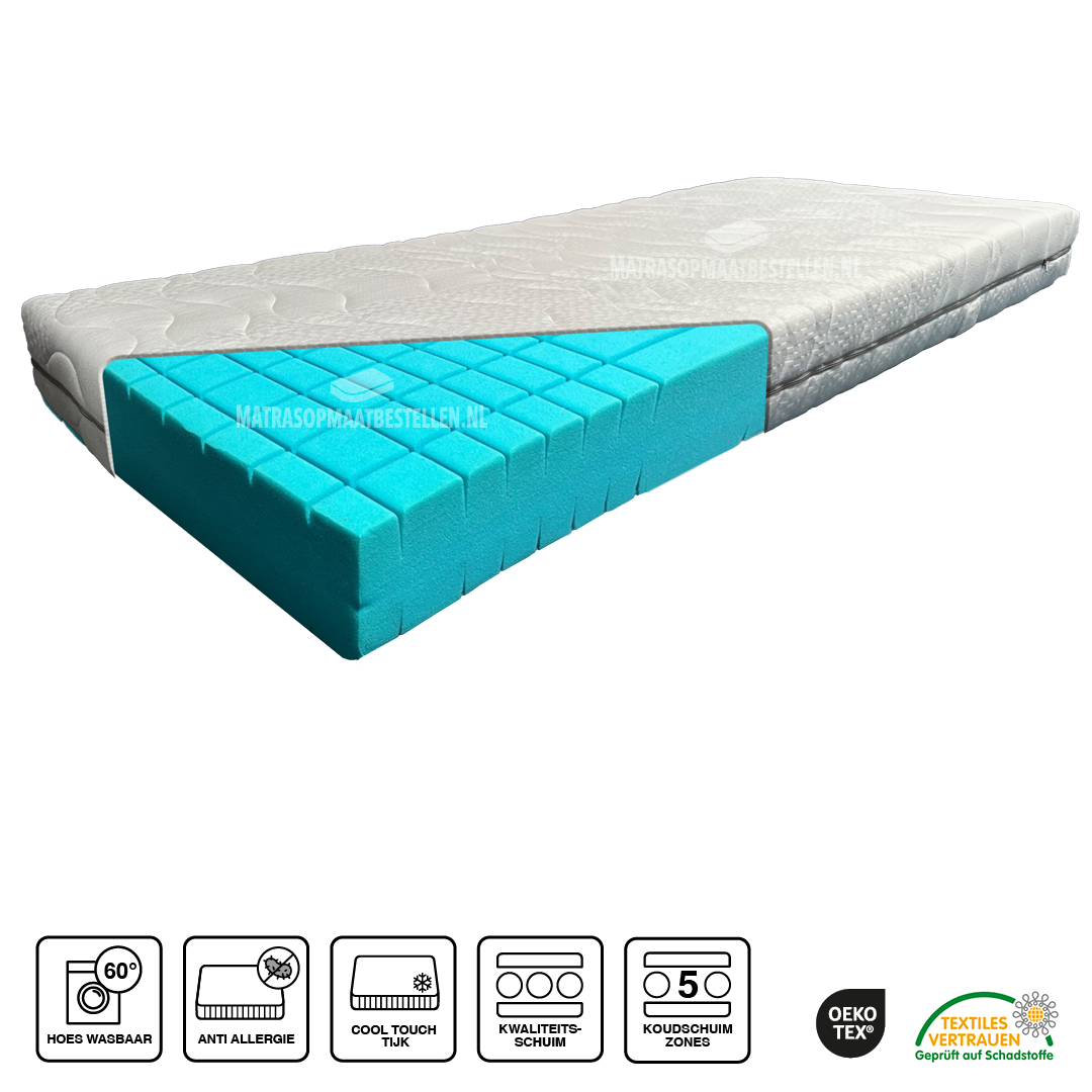 Koudschuim matras HR55 is onze meest verkochte matras . Matrasdikte incl matrastijk 16 cm .De hoge dichtheid garandeerd een soepel tot medium ligcomfort ,ideaal voor personen tot 110 kg per persoon. Koudschuim met deze hoge dichtheid garandeerd een goede ondersteuning en levensduur. De zeer open celstructuur zorgt voor een uitstekende transpiratie en vochtverwerking en een aangenaam slaapklimaat. De matras heeft standaard een afneembaar wasbare hoes,voor een kleine meerprijs leveren wij deze met Cooltouch® tijk, 40 graden wasbaar,anti bacterieel