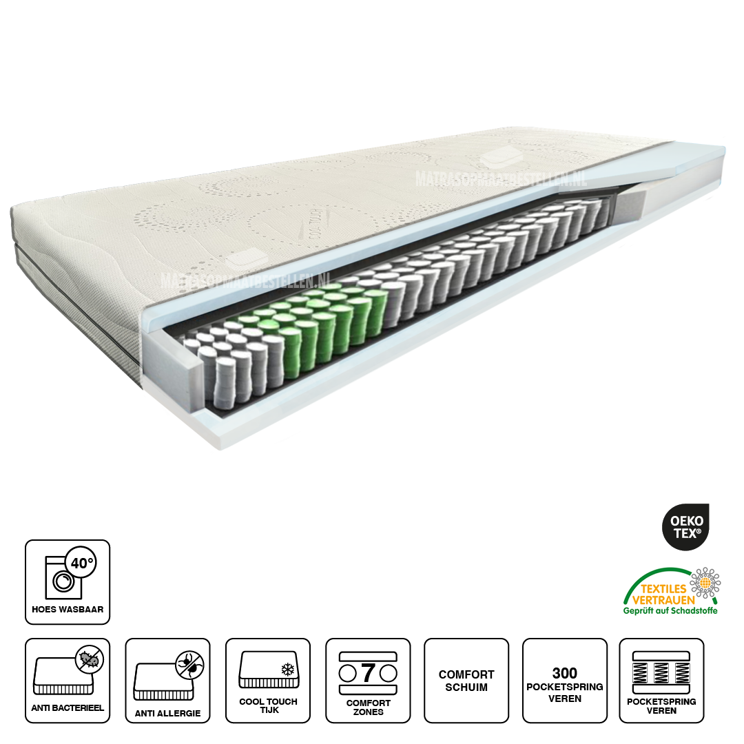 De Pocket Comfort is een pocketveermatras 300 veren/M2 met een comfortschuim/polyether afdeklaag van 3 cm weerzijdig.De 300 veren per vierkante meter en 7 comfortzones zorgen voor een goede ondersteuning en draagkracht, extra soepel op de schouder en extra verstevigd op de heup. Deze matras is +/- 21 cm dik, Matrastijk Aloa vera is afneembaar en wasbaar 40 graden (ligcomfort Medium-Stevig)