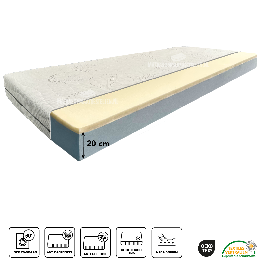 Matras Nasa is een luxe drukverlagende matras met koudschuim HR 55 onderlaag(15 cm) en NASA toplaag van 3 centimeter. Matrasdikte +/- 20 cm ,De hoge dichtheid van de nasa (50) garandeerd een medium ligcomfort voor personen tussen 50 en 130 kg ,Nasa vormt zich dmv. druk en warmte dus past zich aan naar uw lichaam. De open celstructuur zorgt voor een uitstekende transpiratie en vochtverwerking en een aangenaam slaapklimaat.,De matras heeft standaard een afneembaar wasbare hoes,voor een kleine meerprijs leveren wij deze met Cooltouch® tijk, 40 graden wasbaar,anti bacterieel
