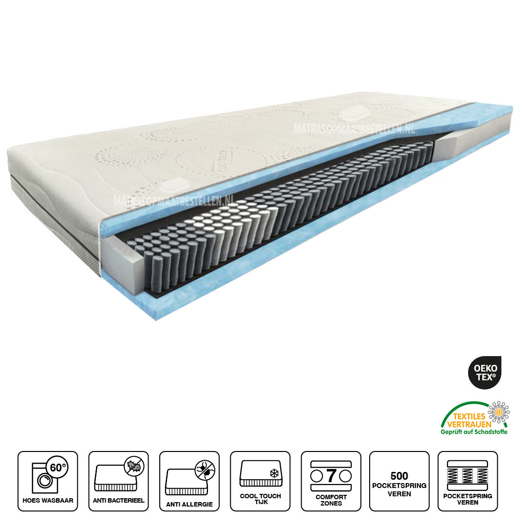 De Pocket 500 HR is een zeer luxe pocketveermatras met een micro-pocketveringskern. Hoe kleiner de veer hoe beter de individuele ondersteuning en stabiliteit,Deze matras heeft een afdeklaag van Hr 45 koudschuim aan beide zijdes welke zeer open van structuur is dus optimaal ventileert. De 500 veren per vierkante meter en 7 stabiliteitszones zorgen voor een goede ondersteuning en draagkracht, extra soepel op de schouder en extra verstevigd op de heup.. Deze matras is +/- 22 cm dik, Luxe Aloa Vera hoes,anti bacterieel en wasbaar 60 graden.(ligcomfort Medium-Stevig)