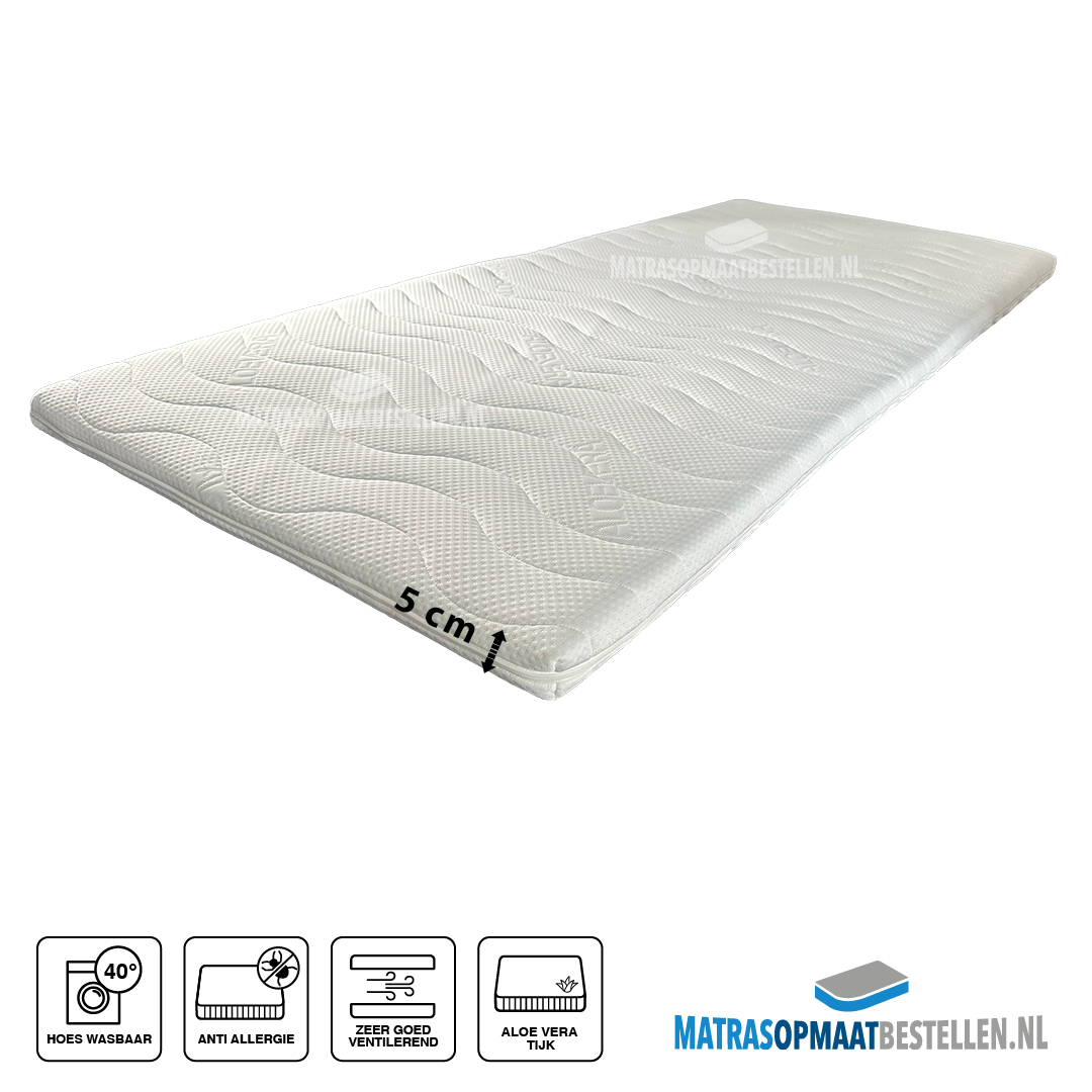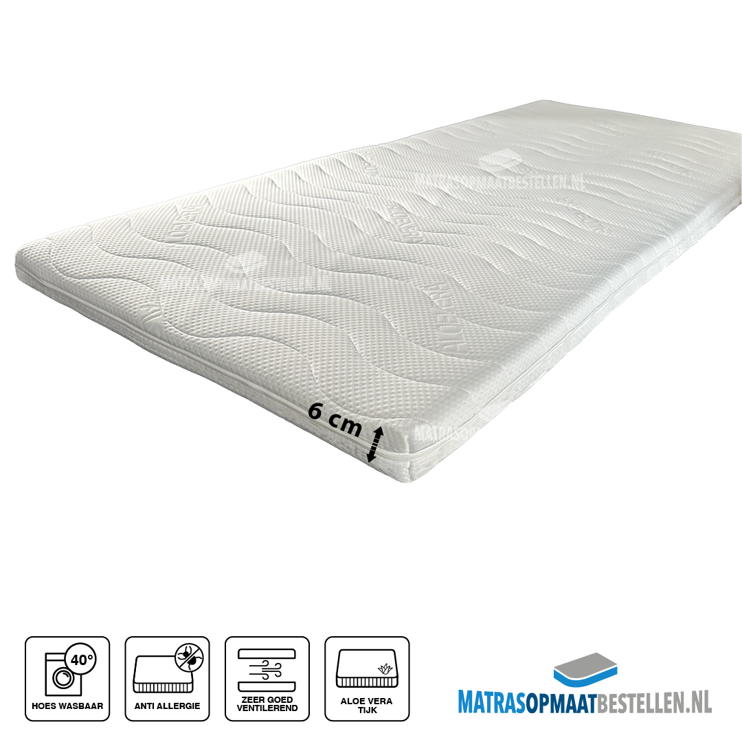 Topdekmatras HR55, dikte inclusief tijk 6 cm . De hoge dichtheid garandeerd een soepel ligcomfort Met deze topper maakt u de onderliggende matras net iets comfortabeler en haalt u die vervelende naad weg tussen bijvoorbeeld 2 matrassen. De zeer open celstructuur zorgt voor een uitstekende transpiratie en vochtverwerking en een aangenaam slaapklimaat. De topper heeft een afneembaar wasbare hoes Aloa Vera ( anti-allergisch ).