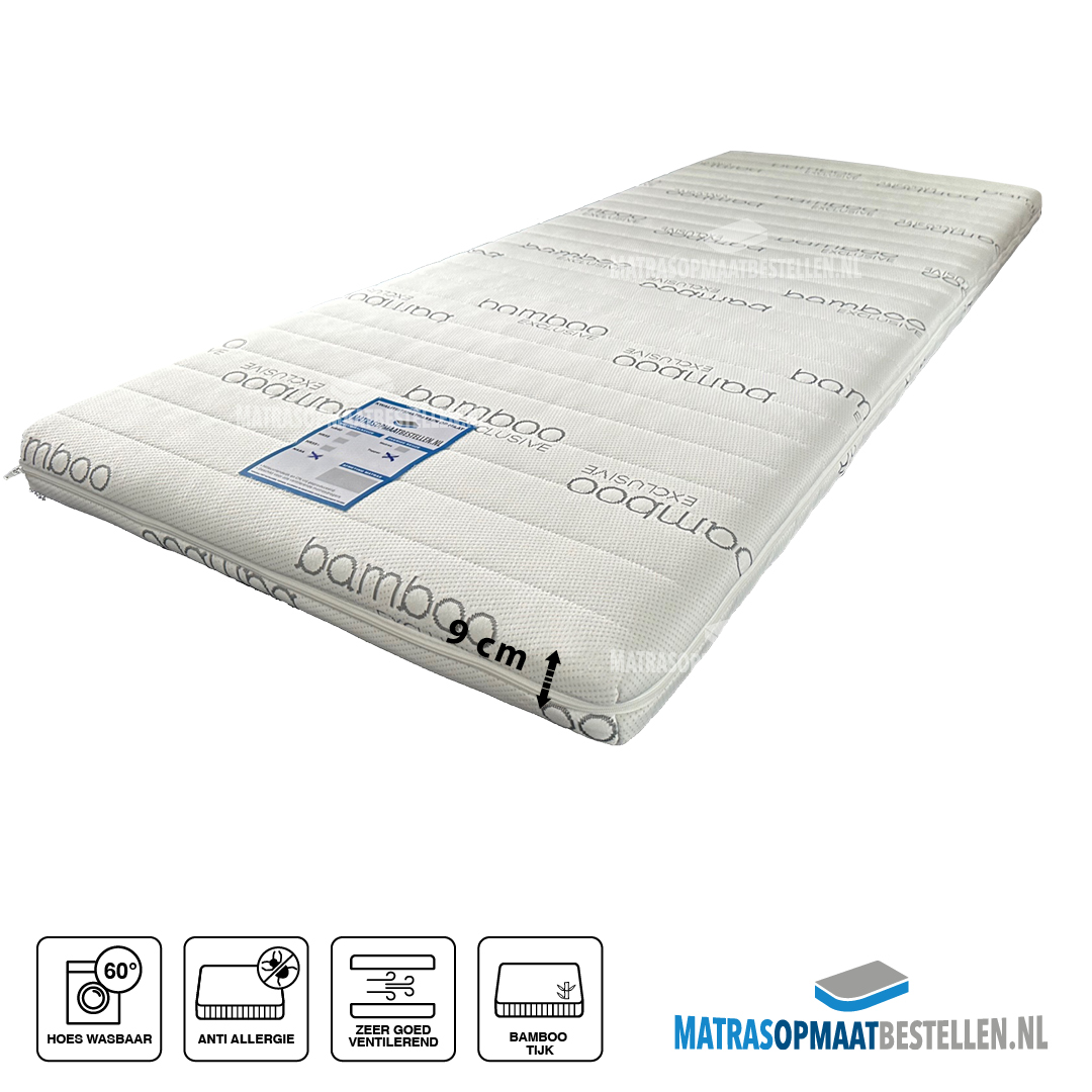 Topdekmatras HR55+, dikte inclusief bamboo tijk 9 cm .De hoge dichtheid garandeerd een stabiel ondersteunend ligcomfort Met deze topper maakt u de onderliggende matras aanzienlijk comfortabeler en de topper haalt die vervelende naad weg tussen bijvoorbeeld 2 matrassen.(extra dik 9 cm) De zeer open celstructuur zorgt voor een uitstekende transpiratie en vochtverwerking en een aangenaam slaapklimaat. De topper heeft een luxe afneembaar Bamboo wasbare hoes (60 graden) (anti-allergisch en anti bacterieel).