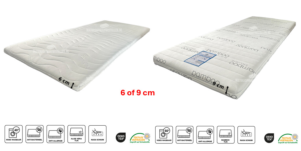 Topdekmatras Nasa leveren in 2 uitvoeringen te weten 6 of 9 cm dikte, Drukverlagend nasa schuim zorgt voor extra ruimte op heup/schouder zonder tegendruk te geven dus maakt uw matras extra comfortabel en ondersteunend .De 6 cm dikke nasa topper heeft een Aloa Vera tijk welke 40 graden wasbaar is, De luxe 9 cm Nasa topper is extra dik dus extra comfort, Bamboo matrastijk , anti allergisch en wasbare hoes 60 graden dus anti bacterieel
